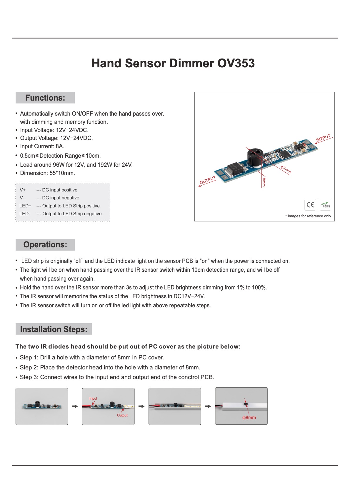 Bezeichnung: Kontaktloser Näherungsschalter für den Einbau in Aluprofil, direkt an Streifen anlötbar Schaltleistung: 192 Watt bei 24 Volt, 96 Watt bei 12 Volt Größe: 50 x 10 x 10 mm